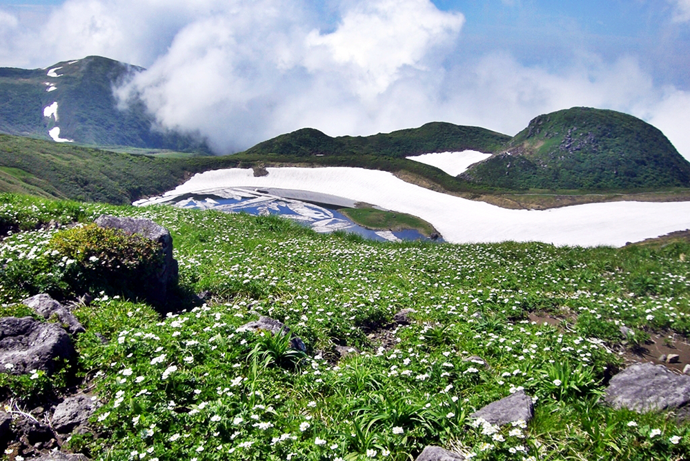 특히 잔설이 녹은 자리로 피어나는 200여 종의 야생화를 만나는 초카이호수(鳥海湖 1,700m) 인근 구릉지는 天上화원의 진수를 보여주는데 이 야생화의 절정은 8월초까지 이어집니다.