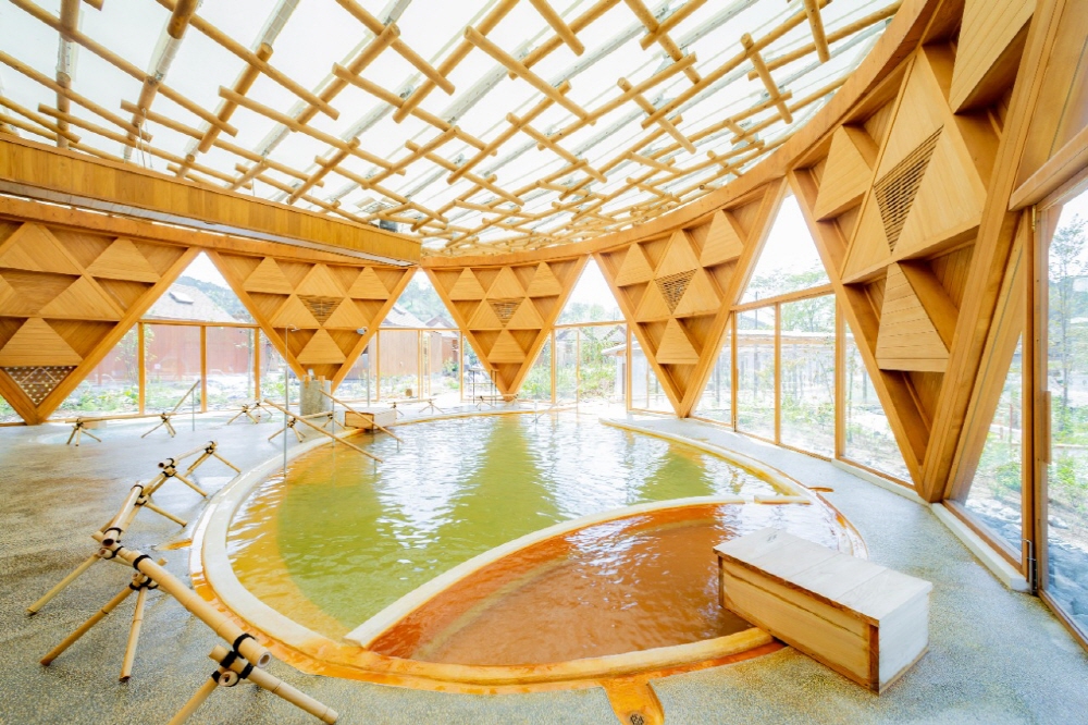 이 시설을 설계한 반 시게루는 압도적인 구쥬연산(九重連山)의 사계절 아름다운 자연의 변화에서 착안해 고정되고 격리된 온천 시설의 공간적 한계를 벗어나 자연 속에 있는 듯한 느낌, 공원을 산책하는 기분으로 자연 채광의 온천탕을 걷고 즐길 수 있도록 개방감 있는 온천시설을 만드는데 집중했습니다.