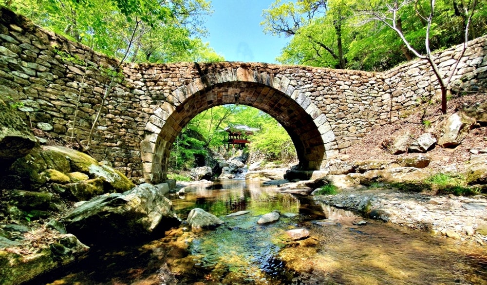 선암사 계곡에 놓인 조선시대의 돌다리, 승선교도 시선을 사로잡습니다. 돌을 깎아 아치형으로 쌓아 올린 모습이 마치 고운 무지개 같습니다. 바람 한 점 없는 날엔 물에 비친 승선교의 아치가 완벽하게 원을 그립니다. 계곡으로 내려가면 아치 사이로 신선의 놀이터라 불리는 강선루도 한눈에 담을 수 있습니다. 선암사를 대표하는 풍경입니다.